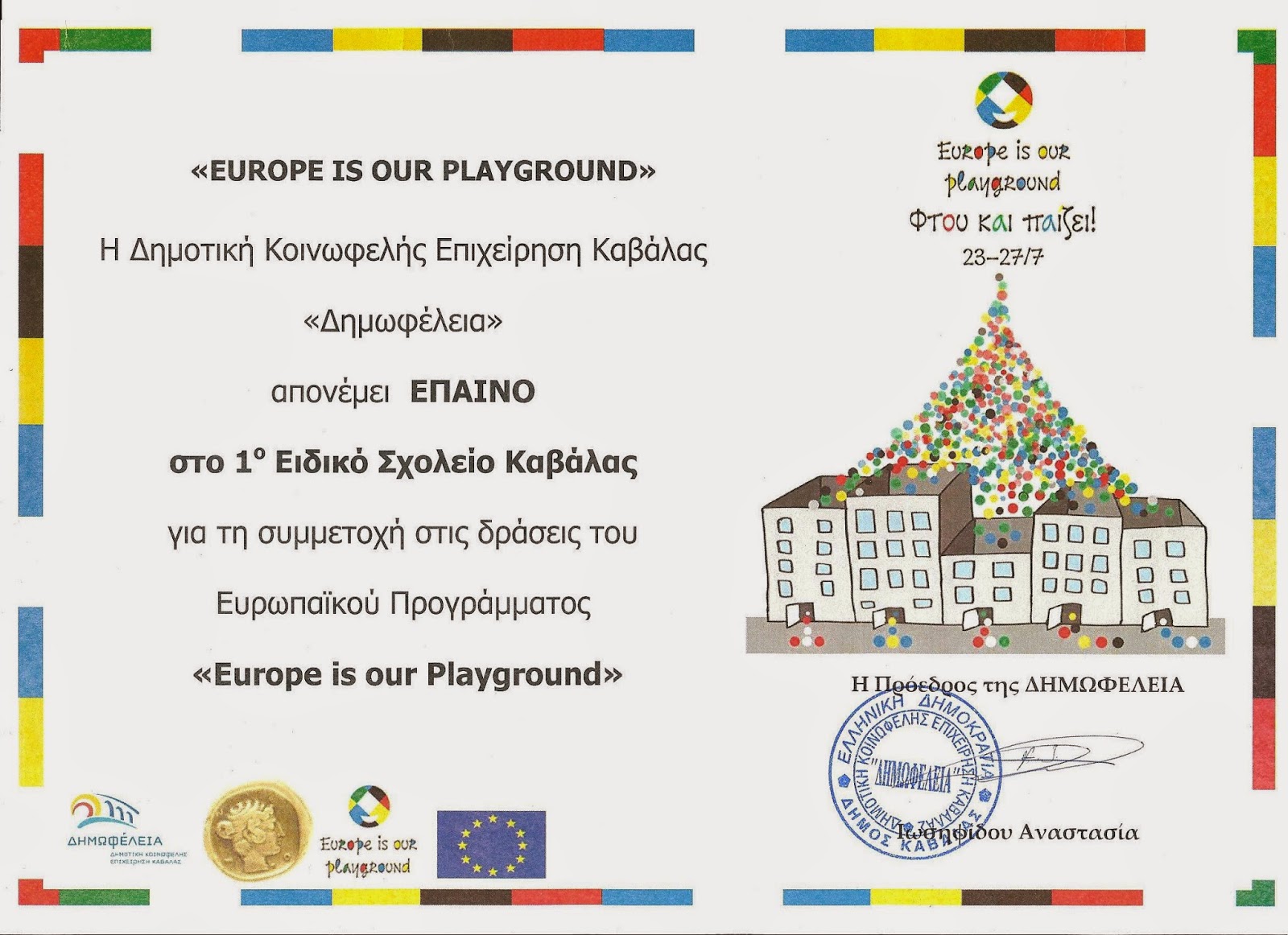 Η «Δημωφέλεια» Καβάλας απένειμε έπαινο στο σχολείο μας για τη συμμετοχή του στο φεστιβάλ που πραγματοποίησε στο πλαίσιο του Ευρωπαϊκού Προγράμματος «Europe is our Playground».