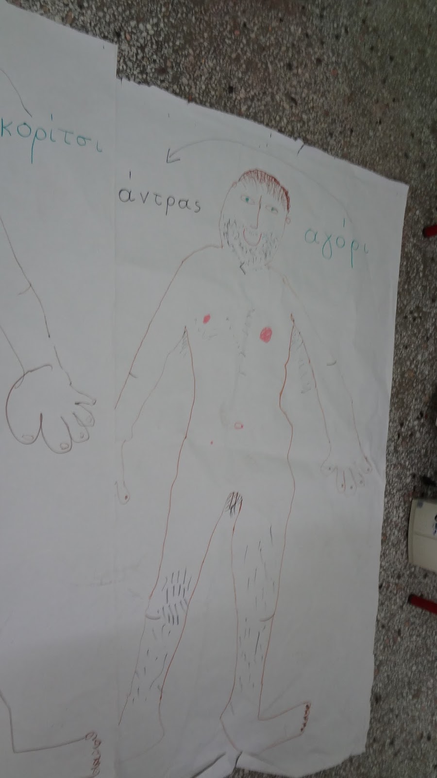 Ξαπλώνουμε πάνω σε μεγάλα χαρτόνια και φτιάχνουμε το περίγραμμα του σώματος από ένα αγόρι και ένα κορίτσι. Συζητάμε τις αλλαγές στα φύλα και τις αλλαγές στην εφηβεία και τις ζωγραφίζω στο χαρτόνι.